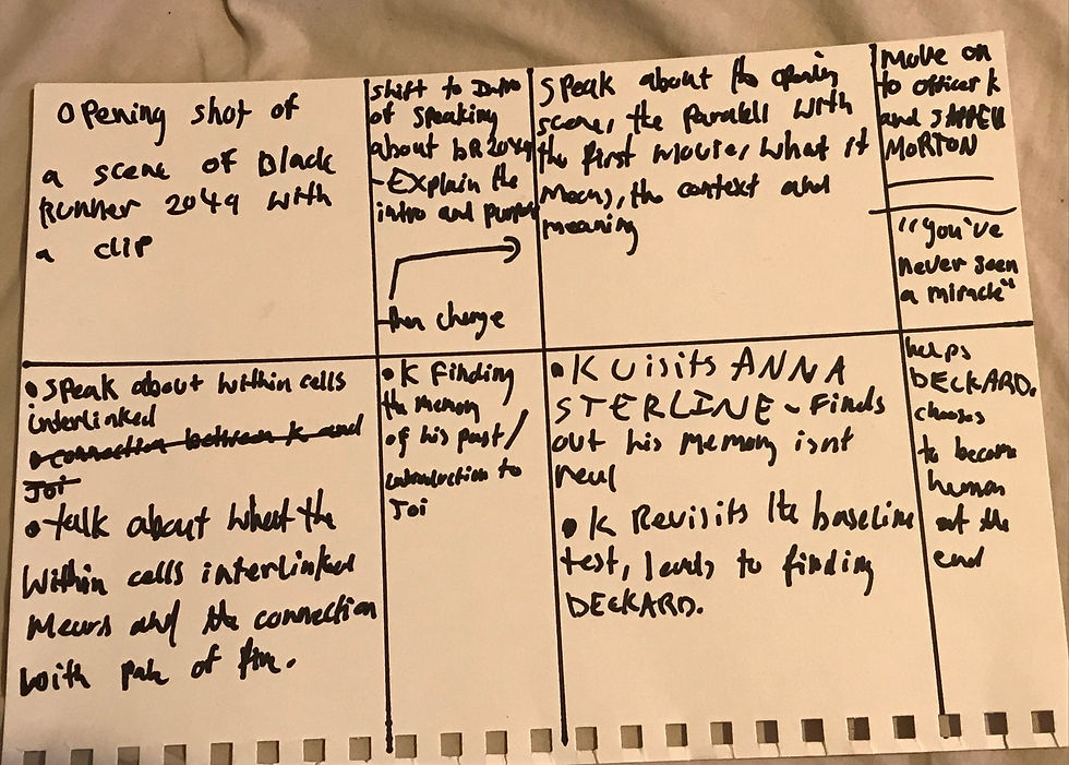 Everything I've done for the script, i started to type and speak about blade runner 2049, in order and made sure it was all structured wise when speaking. for each part as mentioned, i added like some kind of subtext/ sub heading so i know what part i am about to speak about . when writing/typing out the script i had to make sure whatever i was speaking about, had to be fully clear and in my own words so that to me it would make sense when viewing as a video.. it was a much better way for me to follow my own created script rather than speaking naturally because i felt like speaking naturally, it would not make sense because as i would be speaking randomly and off the top of my head.